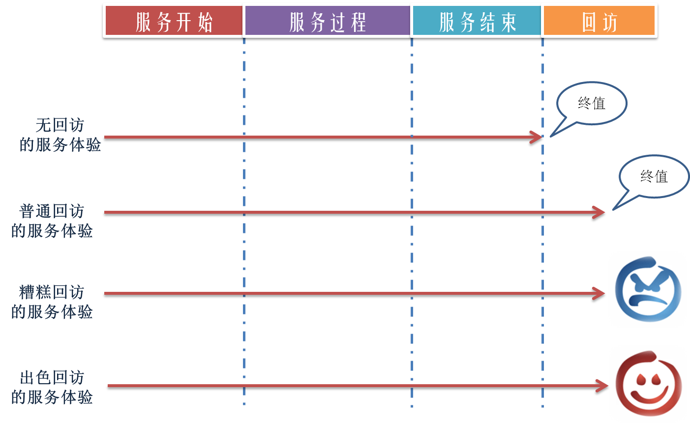普通回访的服务体验:客户的终值体验停留在没有特别体验的回访,程式化、无感、简单配合。这类回访改变了服务体验的终值时刻,但对客户的体验与记忆通常并没有实质性的影响。