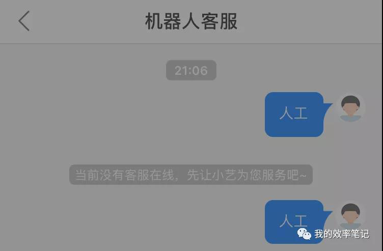 由于笔者本能地对是个公司就用“机 器人”心生抗拒,更不敢苟同遍地的“智能”,所以进入在线咨询后毫不犹豫地输 入“人工”。正常情况下“机器人”识别 出人工需求会跳过自动应答转到人工服 务,小艺做到了这一点,只是为什么页面显示当前没有客服在线?再深入想想有点 疑惑,“没有客服在线”是什么意思?是不在人工服务时段,没有任何人工客服在线?还是人工客服都在忙,没有空闲客服在线?这句话说的有点含糊(如图 1)。