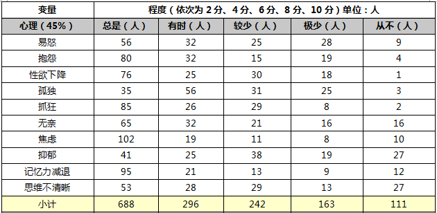针对新员工离职情况与座席压力较大的现状在客服专员中随机选取了150名入职半年内的90后座席从心理、身体、行为三个维度的不同程度做了一项问卷调查,问卷调查题目如表1所示: