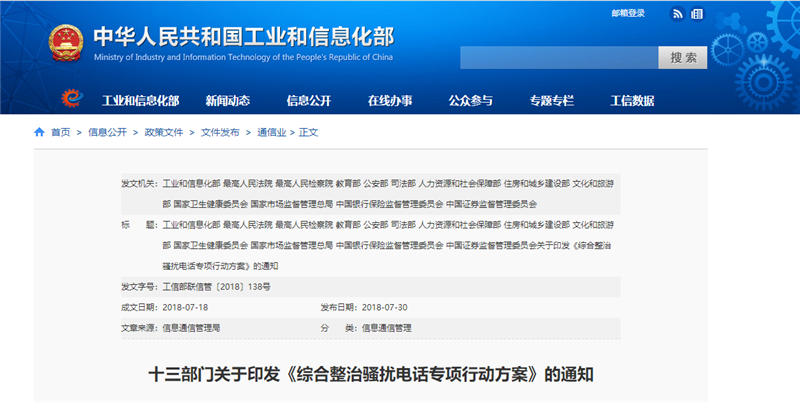 2018年7月31日,工信部等十三部门联合印发《综合整治骚扰电话专项行动方案》的通知,决定自2018年7月起在全国范围内组织开展为期一年半的综合整治骚扰电话专项行动。