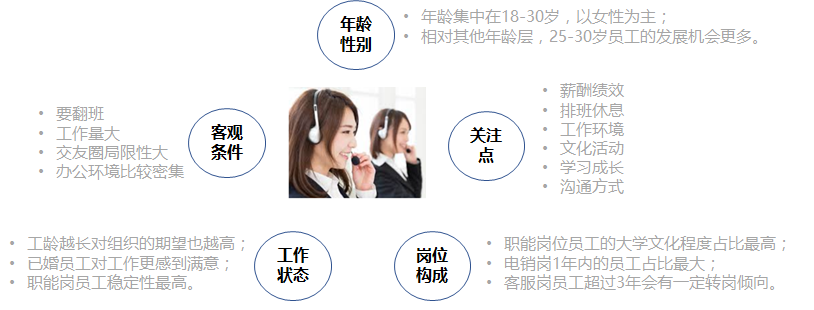 根据呼叫中心员工的用户特征定义,笔者将曾经做过的呼叫中心员工调研数据重新进行了整理,其中显性特征以统计图表的方式归纳,隐性特征则以关键字提炼为主。图1、图2、图3是部分示例。