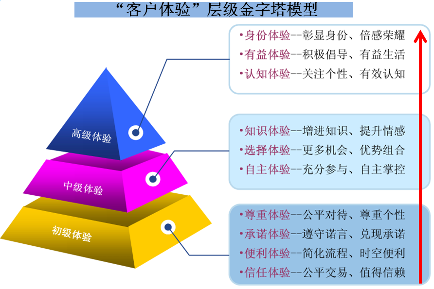 在客户体验中,企业提供的不仅仅是商品或服务,它提供最终体验,并充满了感情的力量,给客户留下了难以忘却的愉悦记忆。“体验式营销”的威力在于使客户以个性化的方式参与其中,通过体验对品牌产生情感寄托,从而成为品牌的忠诚客户。产品是有形的,服务是无形的,而所创造出的体验是令人难忘的。随着互联网经济的飞速发展,很多线上的体验及VR技术应用也得到了广泛的发展。在客户体验管理过程中,结合产品、服务及体验,我们需要对“客户体验管理的层级”做深入细致的布局和有效的规划(如图4)。