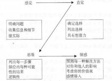 请看下图2——使用感觉来获得相关事实,使用直觉来获得可能有用的方法,使用思考来确定结果,使用情感来考虑结果对相关人群造成的影响。