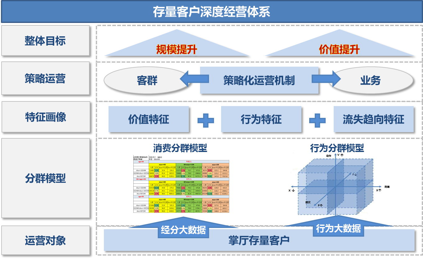 瞄准规模和价值两大目标,从“消费”和“行为”两大方向挖掘客户潜在偏好和需求,结合特征画像到到场景推送,建立了存量客户深度经营体系,精细甄别各类存量客户。