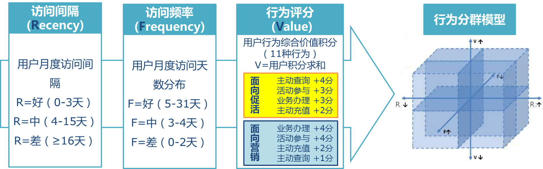 除了以上基于静态消费属性的传统分群方式以外,作为本项目的一大创新突破,就是构建了掌厅独有的一套动态行为分群模型。主要强化应用了电商已建立成熟的行为大数据,将客户行为颗粒度细化到个体单次访问的层面,据此研究设定访问间隔(Recency),访问频率(Frequency),行为打分(Value)三大维度,具体如图3所示。