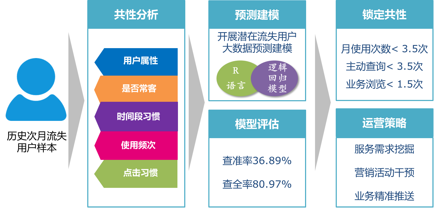 为了进一步洞察客户未来的关键趋向,电商中心在充分融合以上两类画像结果后,利用大数据方法开展潜在流失客户预测建模,从而锁定掌厅易流失客群特征,结合多样化的策略,实现跨前一步预警干预,有效保有存量规模(如图6)。