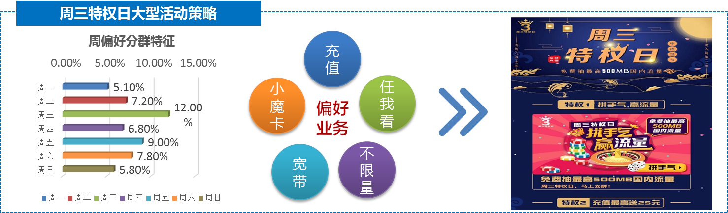 同时,我们在充分研究了存量客户的业务偏好、时间偏好等特征的基础上,设计了一项大型整合活动策略——“周三特权日”(如图8)。