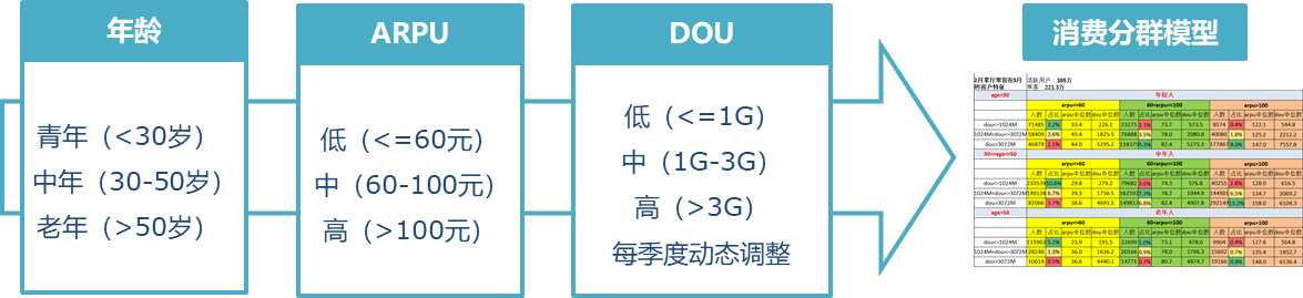 从洞察用户潜在价值出发,充分利用经分大数据,找到能够快速区分客户消费水平的分类标准,构建消费分群模型。主要基于年龄,ARPU,DOU三大维度,结合掌厅存量客户现有分布情况,定义相应区间,具体如图2所示。