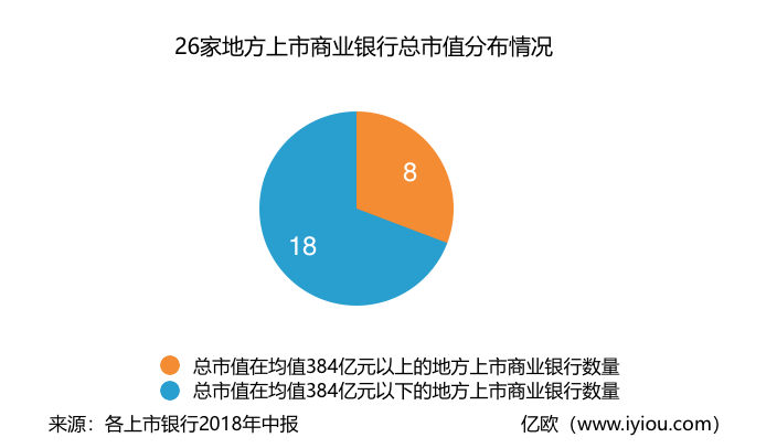 总市值方面,从上市银行整体来看,26家城商行、农商行总市值为9972亿元,均值为384亿元。从分布来看,26家银行中,仅由8家总市值在均值384亿元以上,也就是说,70%的银行总市值低于均值。