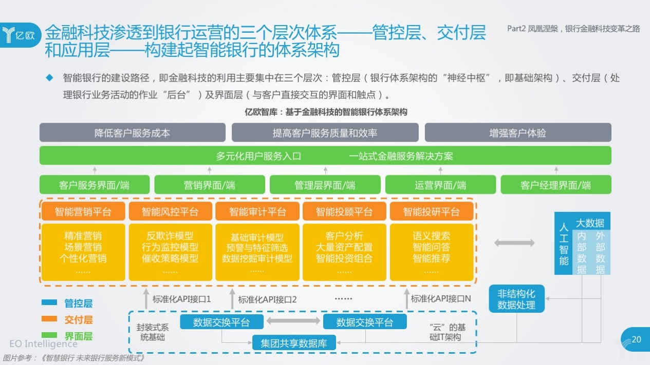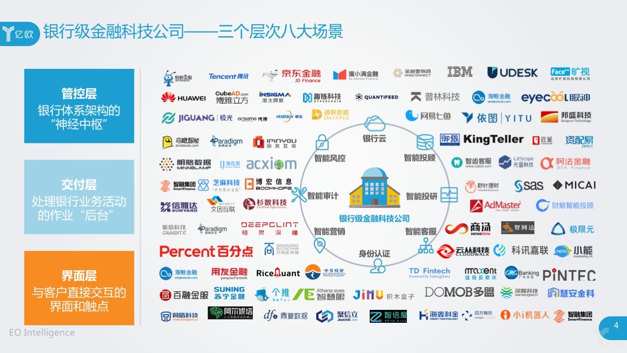 亿欧认为,金融科技公司服务银行贯穿银行运营的三个层次体系:管控层(银行体系架构的“神经中枢”,即基础架构)、交付层(处理银行业务活动的作业“后台”)及界面层(与客户直接交互的界面和触点),主要涉及八大应用场景——银行云、智能营销、智能风控、智能审计、智能投顾、智能投研、智能客服、生物认证。
