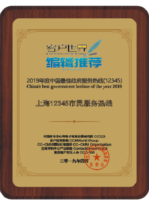 上海12345市民服务热线荣获《客户世界》编辑推荐:2019年度中国最佳政府服务热线(12345)