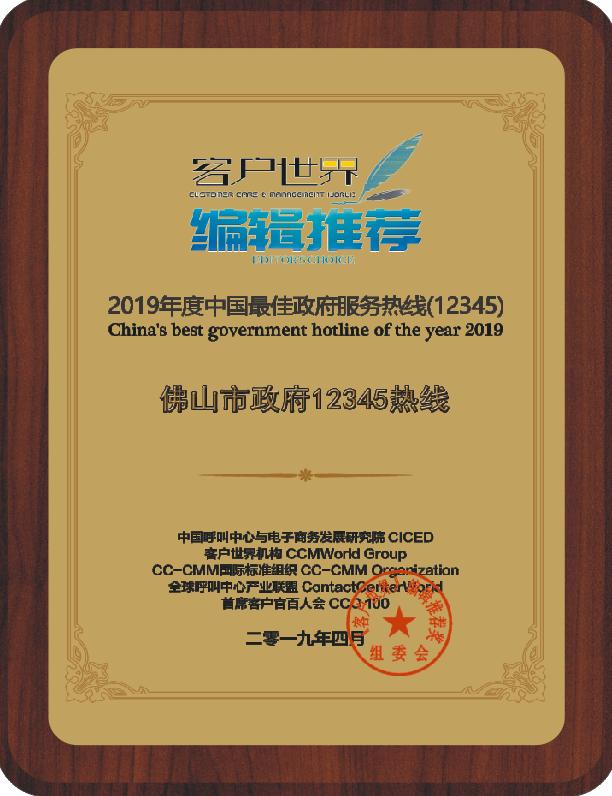 佛山市政府12345热线荣获《客户世界》编辑推荐:2019年度中国最佳政府服务热线(12345)
