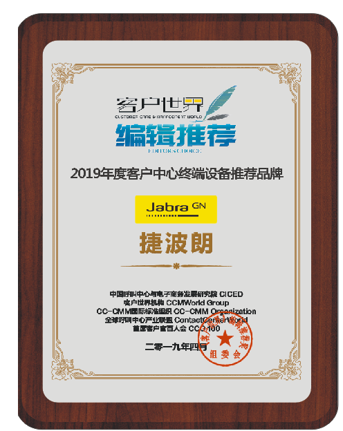捷波朗(Jabra)大北欧通讯贸易(上海)有限公司荣获《客户世界》编辑推荐:2019年度客户中心终端设备推荐品牌