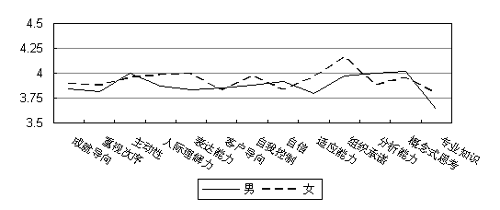 按性别分类的分析结果表明:男女员工对各项胜任特征的符合程度不存在明显差异。在人际理解力、表达能力、适应能力、组织承诺和专业知识等胜任特征上,女性员工的符合程度略高于男性员工;在分析能力方面,男性员工的符合程度略高。