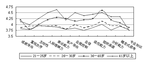 按年龄分类的分析结果表明:不同年龄员工对胜任特征的符合程度具有一定差异。随着年龄的增长,对人际理解力、表达能力、自我控制、自信、适应能力、组织承诺和分析能力等胜任特征的符合程度也不断提高。