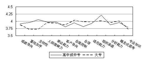 按学历分类的分析结果表明:在重视次序、主动性、组织承诺等方面,高中或中专学历的员工的符合程度略高于大专学历的员工。在自我控制、自信、分析能力和概念式思考等方面,大专学历的员工的符合程度略高于高中或中专学历的员工。