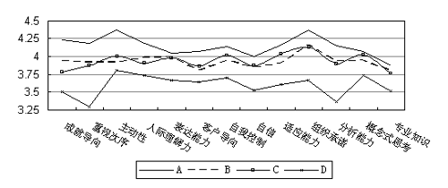 按绩效考核结果分类的分析结果表明:绩效考核为A的员工,对各项胜任特征的符合程度普遍高于其他三组员工;绩效考核为D的员工,对各项胜任特征的符合程度普遍低于其他三组员工;绩效考核为B和C的员工,对各项胜任特征的符合程度没有明显差异。