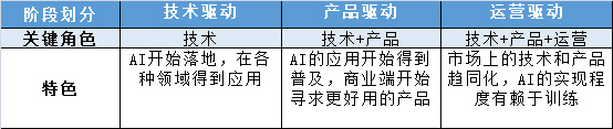 我们也可以类似地看待AI领域,即存在技术驱动、产品驱动还有运营驱动(人工智能训练师为主)这三个阶段。不同的是,得益于成熟的互联网模式和开源的技术思想,AI领域的进程快得多,互联网从开始到现在花了将近三十年,而AI只用四五年时间就迅速成熟起来,现在已经是在产品驱动和运营驱动之间了。另外,运营这一部分也增加了人工智能训练师这一重要角色。