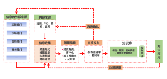 知识运营的核心是将组织中信息、经验和流程进行沉淀和应用,以知识库为工具进行知识的运营和共享,当各类知识应用场景需要时,能快速调用所需知识,保证高效准确解决客户问题。这个过程需要来源于市场、采销、售后、财务、平台侧的信息支持,也需要客服中心自身服务经验的积累和传承,为了知识运营团队能及时准确的获取这些信息并将其应用的客户服务方案交付中,就需要制定一套完善的基于信息流的知识运营工作机制,明确从信息收集、知识加工和审核发布等一系列运营动作的职责分工和评价机制。