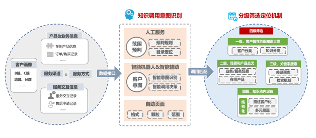 基于客户属性和服务场景,前置知识调用意图识别,以知识分级筛选机制精准匹配人工服务、智能机器人和自助页面的知识调用需求。