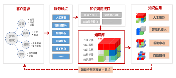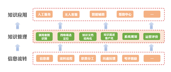 知识库作为客服中心信息运转中枢,对于人工坐席、智能机器人、自助服务、智能辅助的信息支持应该是统一规划和运营的,以改善服务效率和客户体验为目标,基于信息流,在知识管理层面对知识信息进行分类、分级、结构化和客户化加工,依托知识库系统和接口,支持人工客服、无人客服面向客户服务交付场景的信息获取需求。