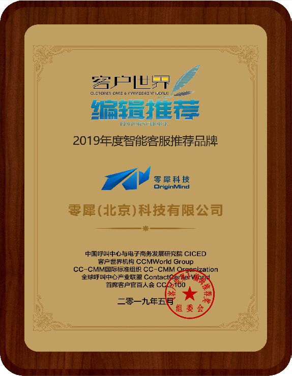 “零犀科技”荣获《客户世界》编辑推荐:2019年度“智能客服”推荐品牌。