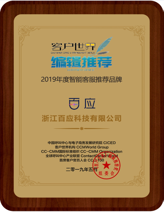 百应入选《客户世界》编辑推荐: 2019年度“智能客服”推荐品牌榜