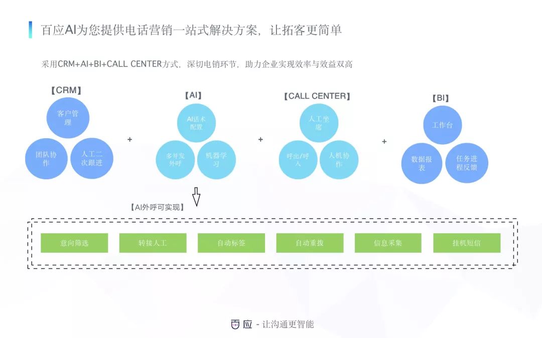 百应是国内专业的AI智能解决方案提供商,是国内首批将人工智能和大数据技术应用到商用领域的公司。通过不断更新和迭代,百应已构建出覆盖企业全流程的产品体系,打造出AICC、百应语音机器人等完备的智能销售产品矩阵和解决方案。