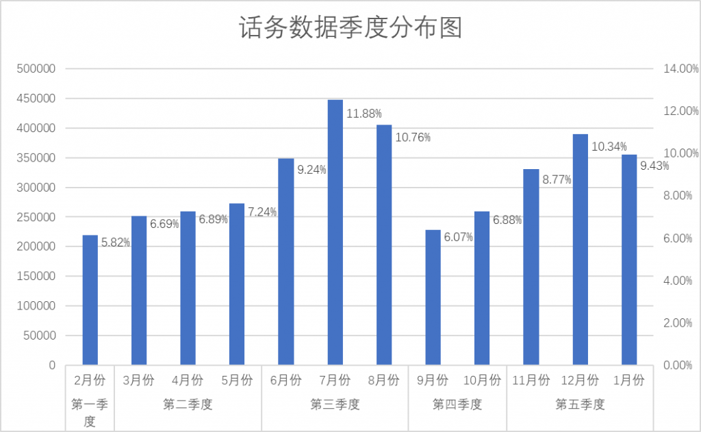 数据时间维度选取的数据,可以通过分析每月话务量的总数、占比、季节、营销事件等条件,将话务量进行分类划分,方便、精确分析各类数据。下面就以2018年某地话务量为例(图1),综合每月话务量的总数、占比数据分析。我们将一年的话务量大致分为第一季度(2月份),第二季度(3月~5月),第三季度(6月~8月),第四季度(9月~10月),第五季度(11月~次年1月)。在这每个季度中,我们又将每日48点话务量细化分为工作日、非工作日及法定节假日。