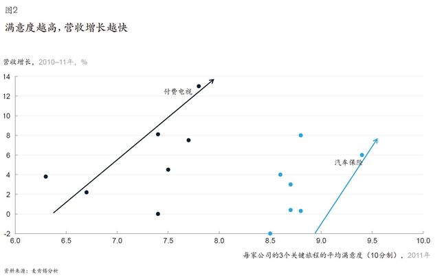 与我们沟通的大都高管都已为理解客户路程的概念做好筹办,但他们还想明白,完美客户路程可否带来真金白银的回报。我们每一年城市进行跨行业客户体验查询拜访,触及付费电视、零售银行、汽车保险和其他范畴。这项研究表白,完美客户体验确实可以带来真金白银的回报。在客户路程方面表示出色的公司常常能博得市场。例如,在保险和电视行业,客户路程方面的表示越好,营收增加常常也就越快;事实上,以企业最主要的客户路程所取得的客户对劲度为尺度来权衡,若是满分是10分,那末对劲度每提高1分,营收增速最少会加速3个百分点(见图2)。
