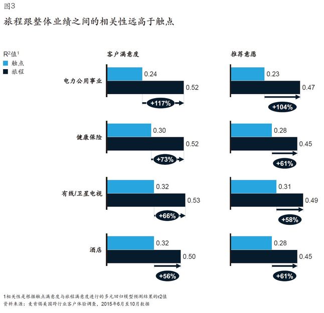 客户路程在晋升业绩方面为什么如斯有用?起首,我们的研究表白,借助客户路程,客户更轻易展望他们可否到达巴望的成果。在大都行业,对客户最为主要的三段路程诠释了跨越25%的客户对劲度。事实上,各个行业的客户路程表示跟客户对劲度之间的相关性都远高于触点表示——客户路程表示跟营收、客户流掉率和商品复购率等贸易指标之间的相关度也远高于触点表示。换句话说,供给不同凡响的客户体验更有可能激起客户反复采办、消费更多、推荐给朋侪,并能加强客户忠诚度(见图3)。