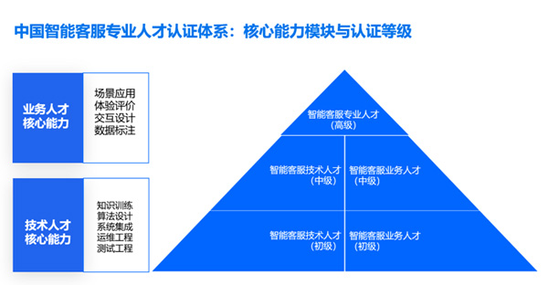 同时,会上针对智能客服岗位谱系及其“智能客服专业人才认证”体系架构,与会企业、专家根据各自实践经验,取得初步共识,即将智能客服专业人才分为初中高三个层级,其中初级与中级两个层级分为专业人才和技术人才,而在高级人才,考虑到其能力要求的全面性、综合性,将其合并为一个“智能客服专业人才(高级)”。同时,业务人才核心能力界定为场景应用、体验评价、交互设计、数据标注等四个方面,技术人才的核心能力界定为知识训练、算法设计、系统集成、运维工程、测试工程等五个方面。