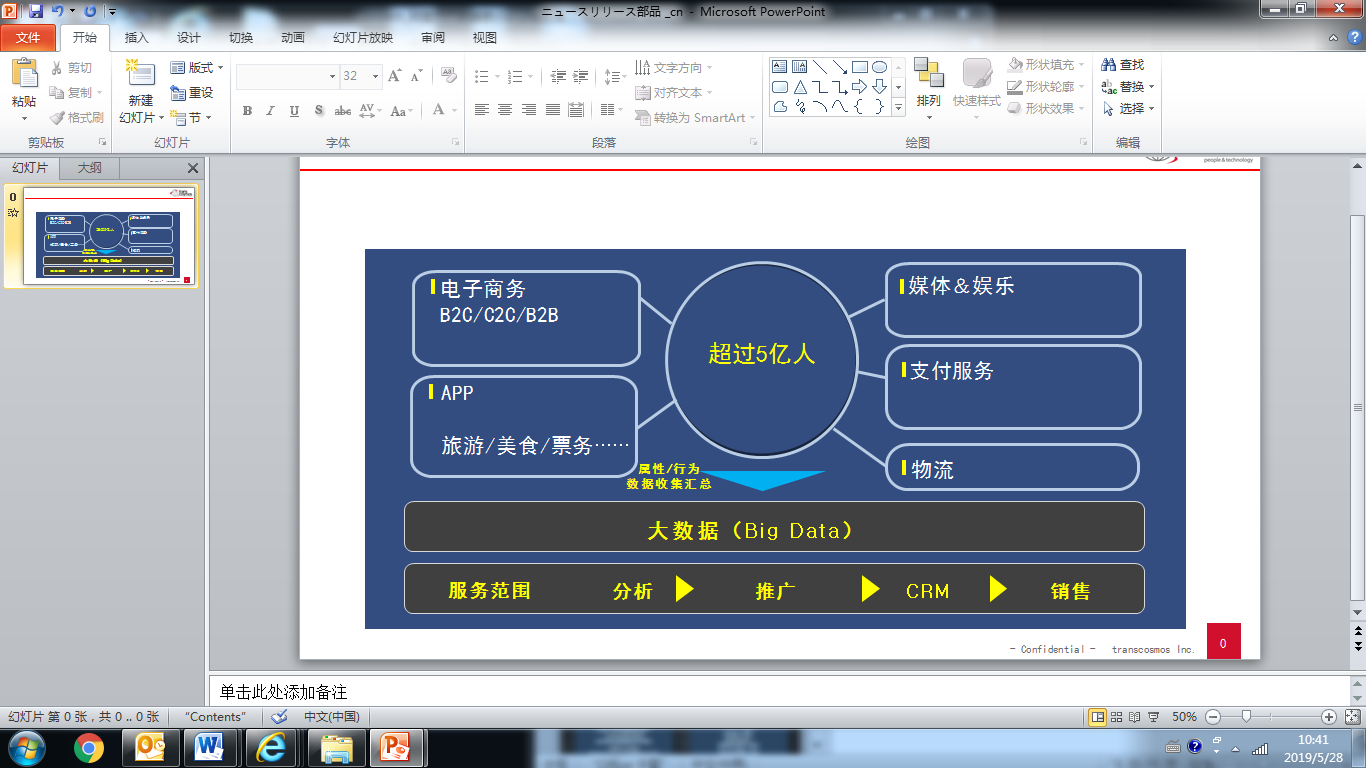 transcosmos集团(中文名:大宇宙集团;以下简称:transcosmos;总部:日本东京;总裁兼COO:奥田昌孝)的独资子公司上海特思尔大宇宙商务咨询有限公司(以下简称 transcosmos China;中文简称:大宇宙中国;总部:中国上海;CEO:山下荣二郎)于2019年4月28日获得阿里巴巴数据银行服务商认证。