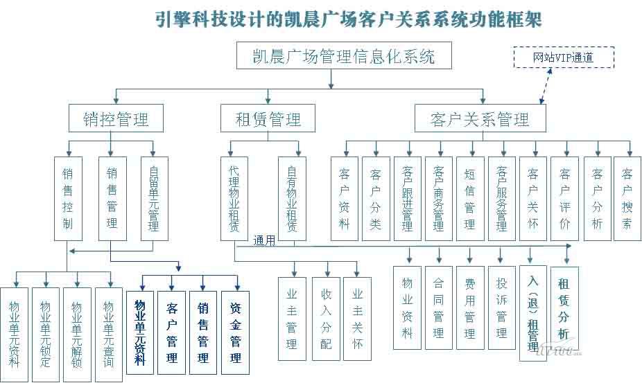 凯晨广场的客户关系管理系统是一个一体化的管理信息系统,基于互联网环境的操作应用,可以从全天候(时间维度)、跨地域(区域维度)、业务团队(人员维度)、客户状态(漏斗维度)四个维度来使用。它包含了客户关系管理、销售管理和租赁管理。这三个子系统数据相互支持,如在销售成交的时候,客户关系里面的前期4类客户自动被调用到销售系统中成为业主,当租户选定一个单元,业主和租户又会形成合同关系,同时产生以租金为主体的资金流管理。当凯晨广场正式交楼、开始运营租赁管理以后,用时间管理、结果导向、过程控制、知识库等其他管理模型也会产生巨大的管理效益,直至百亿目标实现。