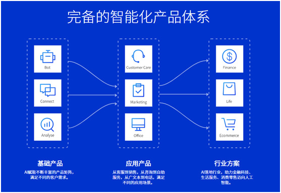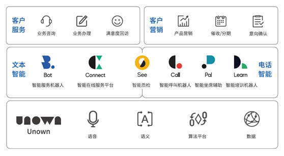 2017年以来,面向金融等垂直领域的深度服务需求,开始推出私有化、整体化的深度定制解决方案,产品矩阵也更加丰富,既有文本端的机器人Bot、智能在线服务平台Connect,也有基于语音电话端的外呼机器人Call、座席辅助Pal和培训产品Learn等。以及基于整个数据打通和闭环化的智能质检产品See。