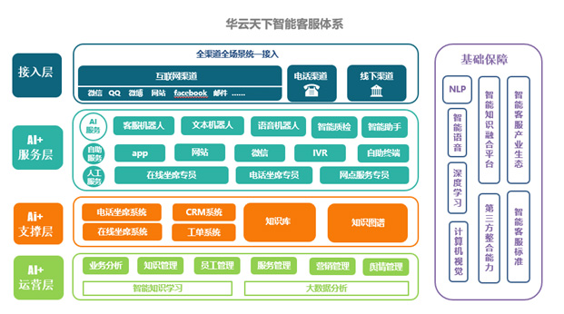 华云天下打造了一整套贯穿售前、售中、售后全过程的智能化、生态化和平台化的智慧服务平台。覆盖企业的主动营销、售前咨询、用户(会员)运营、客户关怀回访、售后服务和企业内部服务,拥有语音机器人、文本机器人、智能坐席助手、智能质检、云呼叫中心、工单管理系统、数据营销CRM、在线客服系统、智几大类主要产品。