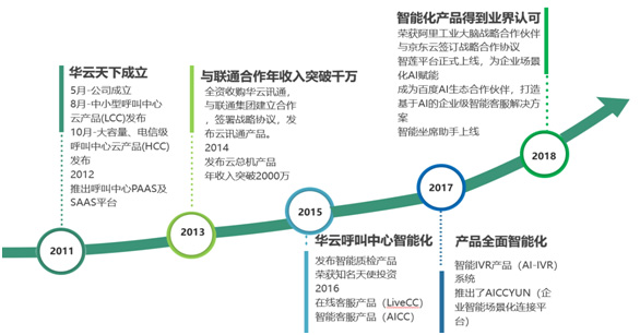 2015年开始,华云天下全面转型客服智能化,先后发布了智能质检、AI坐席助手、全媒体文本机器人、智能外呼机器人、智能IVR导航、智能客服机器人、虚拟调度员、智能前台、智能办公、爱谁谁小秘书等一系列智能化产品和应用。