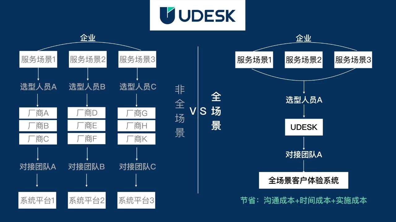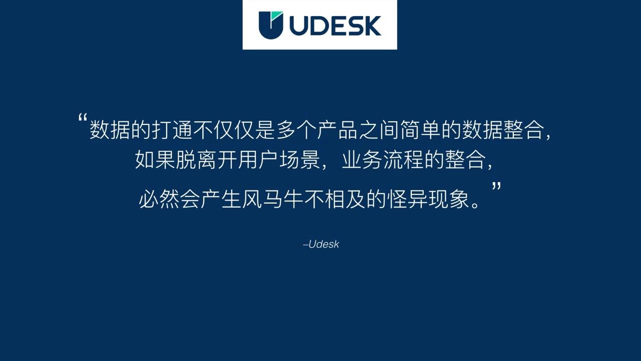 多个独立的产品在发展到一定阶段后,不管是所有权变更,还是产品间要功能整合,还是客户需求促进后来者发展,其实都要面临产品整合的问题,而往往所有的整合都逃不掉数据打通这个前提(除非很多功能不需要共享客户数据)。谈到数据打通,就必然要神一般技术团队的支持了。各个系统相对比较独立,名称和功能也都没有很强的关联,实际使用部门即使能分清楚是哪一家的,但是数据分不清楚啊,数据库要打通,客户行为数据要共享,要同步,这样的难度好比在多个开发商建成的不同大楼上搭建连接平台,打通大厦之间的连接通道,或是建立共享地库,形成一体,与技术团队的沟通成本以及实施难度都是不可预估的。那还要不要打通呢,当然要!这是战略,因为只有打通,各个产品才能共享用户数据,更高效地为客户提供服务。通过数据的整合和联动,增加用户粘性和内部效率。这里面就会涉及到技术团队的高优支持(如果你的企业能做到的话),那就是要有一个能理性分析并能实际落地且有前瞻性的技术Leader拍板,数据的打通不仅仅是多个产品之间简单的数据整合,如果脱离开用户场景,业务流程的整合,必然会产生风马牛不相及的怪异现象。而Udesk全场景智能客服平台本身就是多个自有产品的”容器”,而数据的共享只是原本特点之一,无需花费额外的精力和资源去解决众多公司都难以快速实现的问题。
