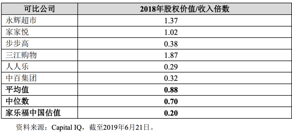 嗯,另一个数据是:A股主要的同行业上市公司2018年平均股权价值/收入倍数的平均值是0.88x,中位数是0.7x。所以,第一个问题是,家乐福为什么愿意以0.2x拱手苏宁?