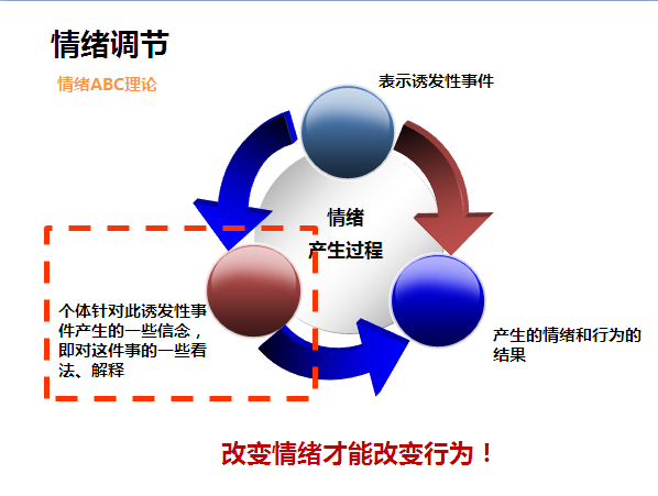 从这个简单的例子中可以看出,人的情绪及行为反应与人们对事物的想法、看法有直接的关系。在这些想法和看法背后,有着大家对一类事物的共同看法,这就是信念,前者在合理情绪法中称之为合理信念,而后者则被称之为不合理的信念。合理的信念会引起人们对事物适当、适度的情绪和行为反应;而不合理的信念则相反,往往会致不适当的情绪和行为反应。大家坚持某些不合理的信念,长期处于不良的情绪状态之中里,最终将导致情绪障碍也就是C的产生。由于情绪障碍是由不合理信念所造成,因此合理情绪法就是要以理性说服非理性,帮助员工以合理的思维方式代替不合理的思维方式,以合理的信念代替不合理的信念,及时向员工指出自己的思维方式、信念的不合理之处;帮助他们弄清楚为什么会变成这样,讲清楚不合理的信念与他们的情绪困扰之间的关系。从而最大限度地减少不合理的信念给情绪带来的负面影响,帮助员工减少或消除情绪障碍保持良好心态去完成工作。