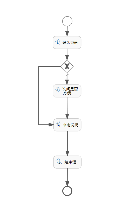 跳转逻辑:确认身份后,如果是持卡人本人,则询问是否方便,若是方便则进入来电说明环节,不方便则第一次挽留客户,第二次结束语挂机,非本人的情况直接结束语挂机。