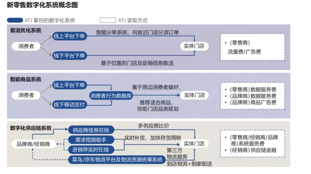 从零售生态的高度看,以阿里、京东、腾讯为代表的互联网企业将成为这一生态中不可或缺的基础设施供应商,提供数字化服务系统。科尔尼认为,这些系统将至少包括三大部分:客流优化系统、智能商品系统、数字化供应链系统。未来零售商和品牌商对这些系统的依赖程度,将像办公室白领离不开office软件一样。而互联网巨头们届时可以通过各类轻资产的衍生服务变现,无需直接参与零售运营。以下详述科尔尼对三大数字化零售系统的设想(见下图):