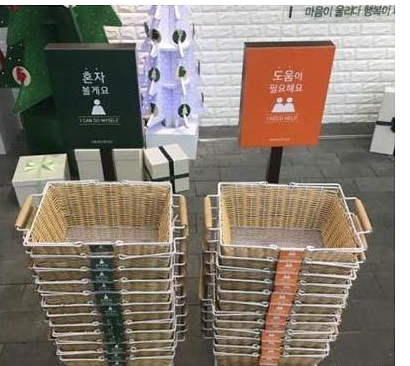 这种超市的提篮上会有颜色区分,红色代表你不介意导购介绍,绿色代表你不需要帮助,导购自然不会向您推荐产品。