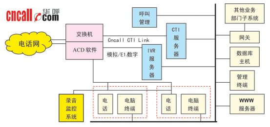 CTI服务器:整个Call Center的核心,通过华呼CTI Link中间件将电话交换系统和计算机系统有机地结合起来,实现CTI服务器与交换机之间进行呼叫状态传递和呼叫控制如智能来话处理、屏幕弹出、语音和数据协调转移、主动外拨、软电话等功能,支持ACD、CDN等先进排队技术。同时还为客户端提供CTC API、TAPI等工业编程接口,还提供ActiveX自动化呼叫控制控件,简化客户端CTI编程。