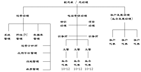 在呼叫中心的组织结构及职能分工上,外包型呼叫中心与企业自建型呼叫中心有很多共同点,它们间主要的区别在于外包型呼叫中心分工更细,而且有很多专门人员,而企业自建型呼叫中主的很多职能是由一人兼任或借助其它部门的支持和服务。从一个典型的外包型呼叫中心的组织结构来看,通常会设置如下一些组织单位: