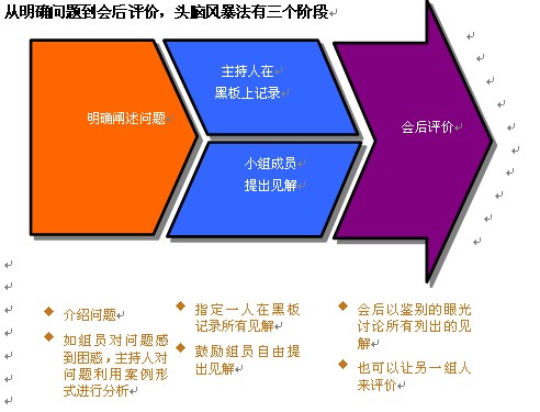 要到评估阶段才能进行评价。如果在“风暴”过程中进行评论,发生员工皱眉、咳嗽、冷漠、叹气、打断提问等等行为,许多员工就会变得更加拘谨。可能会出现,员工不敢发言了,然后结果是他们未发表的意见或许非常好,或许可以激发别人的好意见;所以出现讨论过程中花费在评论上的精力未能用在产生好意见的现实任务上这样一个结果。