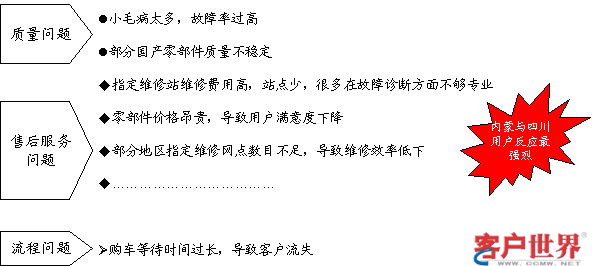 根据麦威对汽车市场的研究,目前各种品牌的很多现有用户的抱怨主要包括以下几个方面:(示例)