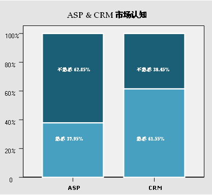 在“您是否熟悉ASP?”和“您是否熟悉CRM?”这两个问题上,在调查得到的所有问卷回复中,有37.95%的被调查者认为其熟悉ASP(Application Service Provider or On-Demand software)模式,而在CRM问题上,却有61.55%的被调查者熟悉CRM(Customer Relationship Management)。相比而言,CRM在市场上更广为人所知,而ASP这种外包的模式在中国市场上尚未占据一定的位置,市场认知度相对较低。