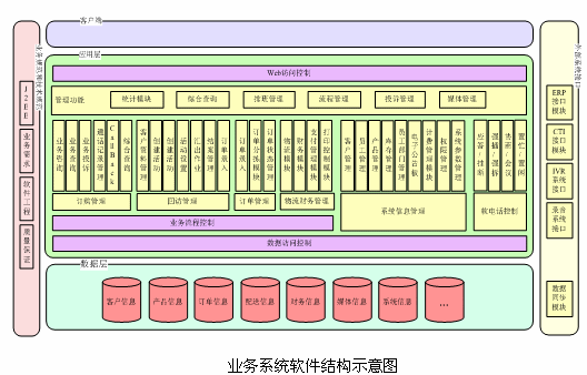 电视购物呼叫中心系统包括客户管理模块、会员管理模块、通话记录、CALL-BACK单、订单管理、订单分检、物流模块、财务模块、计费管理模块、媒体模块、投诉模块、FAQ模块、产品管理模块、库存管理模块、综合查询模块、排班管理、在线培训、电子公告板、事件跟踪管理模块、统计模块、权限管理模块和参数管理模块。