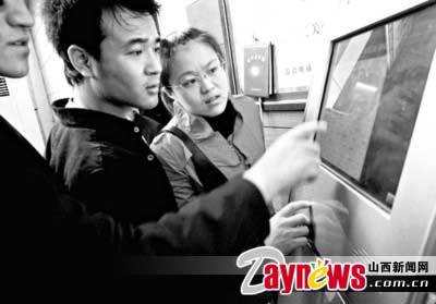 在三楼候车厅的过道里,靠墙摆放着一台电子信息查询机,通过触摸屏能查阅各种信息,包括列车信息、公交信息、山西旅游信息等。但遗憾的是,由于查询机数量太少,不少人不得不排队等候查询。
